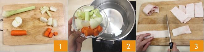 Om de getrouwde soep te bereiden, snijdt u de selderij, ui en wortel grof 1, zet ze vervolgens in een grote pan met water en laat ze enkele minuten op laag vuur koken 2. Maak ondertussen de zwoerd schoon en snijd ze in stukjes 3,