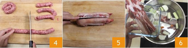 de worst 4 en de ribbetjes, verdeel vervolgens de varkenspoot doormidden 5. Voeg het vlees toe aan de groenten: doe eerst de ribbetjes in de pan 6,