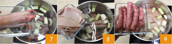 dan de poot 7, de zwoerd 8, de worst 9 en laat alles ongeveer 3 uur op laag vuur koken; indien nodig, voeg zout en peper naar smaak toe.