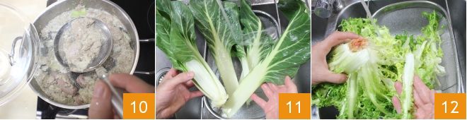 Verwijder van tijd tot tijd met een schuimspaan het 'schuim' dat zich tijdens het koken op het oppervlak van de bouillon vormt 10. Terwijl het vlees kookt, reinigt en wast u grondig de snijbiet 11, de krul-escarole 12,