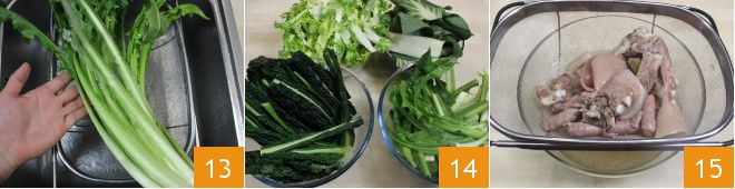 de boerenkool en de cichorei 13, snijd ze vervolgens grof en verwijder de hardere delen en zet opzij 14. Wanneer het vlees goed gaar is, zet het vuur uit, haal het uit de pan en filter de bouillon 15.