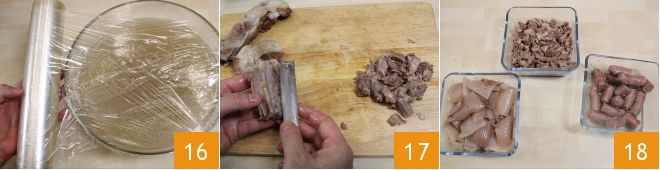 Laat de bouillon een beetje afkoelen, dek deze vervolgens af met folie 16 en laat hem ongeveer 15 minuten in de koelkast afkoelen. Ondertussen maakt u het gekookte vlees schoon, verwijdert u de botten en snijdt u het in kleinere stukken 17. Zo moet het gesneden vlees eruitzien 18.