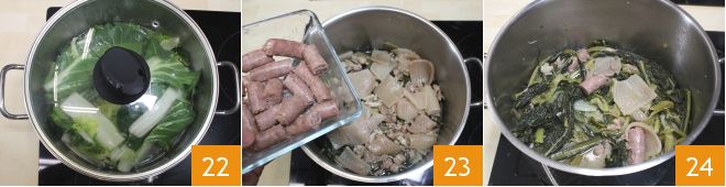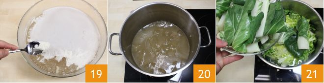 Zodra de bouillon is afgekoeld, haalt u deze uit de koelkast, verwijdert u al het vet dat zich aan de oppervlakte heeft gevormd 19 en zet hem opnieuw op het vuur om op te warmen 20. Voeg de groenten toe (de snijbiet, boerenkool, krul-escarole en cichorei) 21