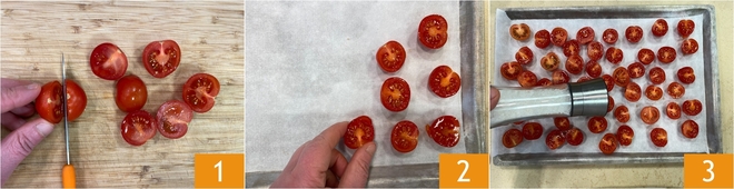 Om de gnocchi met saus van geroosterde cherrytomaatjes te maken, begin je met de tomaatjes. Was ze, dep ze droog en snijd ze doormidden 1. Leg ze op een met bakpapier beklede bakplaat met de snijkant naar boven 2 en breng ze op smaak met een snufje zout 3.