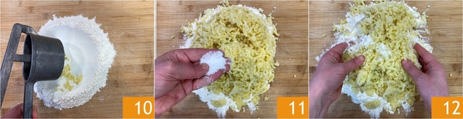 Pers de hete aardappelen rechtstreeks op de bloem, je hoeft ze niet te schillen 10. Voeg het zout toe 11 en kneed snel met je handen 12.