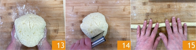Je moet een homogeen deeg krijgen 13, let erop dat je het niet te veel bewerkt om harde gnocchi te voorkomen. Verdeel het deeg in porties 14 en rol er rolletjes van ter dikte van ongeveer 2 cm 15.