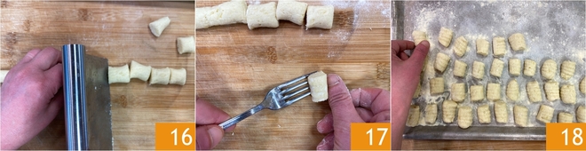 Snijd de gnocchi vervolgens in stukjes 16. Rol elk gnocchi over de tanden van een vork 17 of over een gnocchi-ijser (rigagnocchi) om de klassieke groefjes te krijgen en leg ze vervolgens op een met bloem bestoven bakplaat 18.