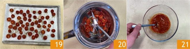 Zodra de tomaatjes klaar zijn, haal je ze uit de oven, verwijder je de knoflook en laat je ze iets afkoelen 19. Doe ze daarna in een passe-vite of zeefmolen (passaverdure) 20 tot je een saus krijgt 21.
