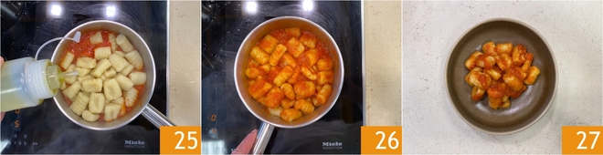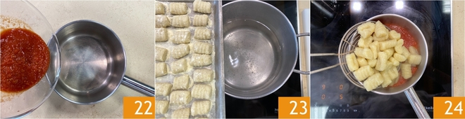 Doe de saus in een steelpannetje en verwarm hem 22. Breng een grote pan met gezouten water aan de kook en kook de gnocchi 23: ze zijn klaar zodra ze boven komen drijven, dat duurt maar een paar minuten. Giet de gnocchi af en schep ze direct in de pan met de saus 24.