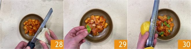 Maak af met geraspte pecorino 28, blaadjes basilicum 29 en geraspte citroenschil 30. In plaats van gewone citroenschil kun je ook wat poeder van geblakerd citroen gebruiken, dat het gerecht een intense en originele aromatische toets geeft. Serveer je gnocchi goed warm!