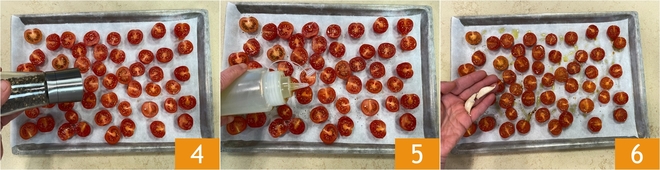 Voeg een snuf versgemalen zwarte peper toe 4, een scheut extra vierge olijfolie 5 en de hele teentjes knoflook 6. Bak ze in een gewone oven op 120b0C gedurende ongeveer 3 uur, tot ze goed ingedroogd en geconcentreerd zijn.