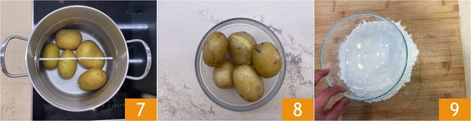 Maak ondertussen de gnocchi. Spoel de aardappelen onder koud stromend water en kook ze vanaf koud water 7. Dit duurt ongeveer 30-40 minuten, afhankelijk van de grootte. Wanneer ze zacht zijn, giet je ze af 8. Maak op je werkvlak een bergje van de bloem en vorm er de klassieke 'fontana' van door de bloem met de onderkant van een kom plat te drukken of met je handen te verschuiven.