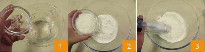 Om de grissini met Grana Padano te maken, los je eerst de gist op in het water en roer je met een lepel 1. Doe de bloem en de geraspte Grana Padano DOP in een kom 2 en voeg zout toe 3.