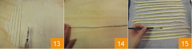 Snijd met een gladde pizzaroller stroken van ongeveer 2 cm breed 13. Rol de stroken met je handen op het werkvlak om de klassieke grissini te vormen 14 en leg ze op een met bakpapier beklede bakplaat. Bestrijk de bovenkant van de grissini met water 15.