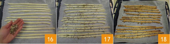 Strooi naar smaak de zaden 16 17 en bak 18 minuten in een voorverwarmde oven op 190 °C (boven- en onderwarmte). Haal de grissini met Grana Padano uit de oven en laat ze licht afkoelen voordat je ervan geniet 18.