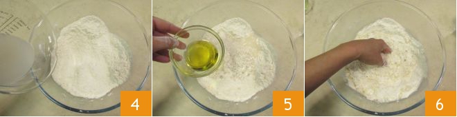 Giet het water waarin je de gist hebt opgelost geleidelijk erbij 4 en voeg ook de olijfolie toe 5. Meng met je handen om de ingrediënten te combineren en de vloeistoffen op te nemen 6.