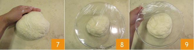 Zodra je een homogeen mengsel hebt, leg je het op een werkvlak en kneed je het nog even tot een compact bolletje 7. Doe het in een kom, dek af met plasticfolie 8 en laat 1 uur rijzen in een uitgeschakelde oven met het licht aan of op een warme plaats. Na deze tijd zal je deeg gerezen zijn 9.