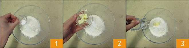 Om de schiacciatine te maken doe je in een kom de bloem, zout, een beetje zuiveringszout afgenomen van de totale hoeveelheid (ongeveer 3 g) 1, de zachte boter 2 en een snufje suiker (ongeveer 3 g). Giet het water beetje bij beetje erbij 3.