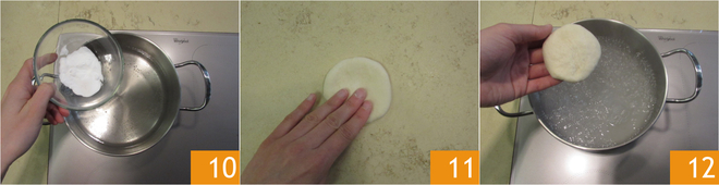 Ondertussen zet je een pan met 2 liter water op het vuur; zodra het kookt voeg je 35 g zuiveringszout toe 10. Neem een bolletje en druk met je vingers uit tot een schijf van ongeveer 8 cm doorsnede 11. Dompel de schijfjes 30-40 seconden onder in het kokende water 12.