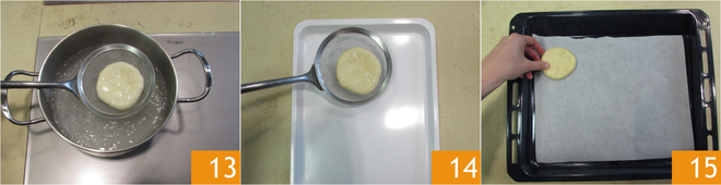 Laat ze uitlekken met een schuimspaan 13 op een schaal 14, en leg ze vervolgens op een bakplaat bekleed met bakpapier 15.