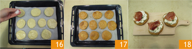 Bestrooi het oppervlak met grove zoutvlokken 16 en bak in een voorverwarmde oven op 2206 gedurende 20 minuten. Haal na de baktijd uit de oven 17 en laat afkoelen. Beleg de schiacciatine met stracciatella, speck en fijngesneden bieslook 18.