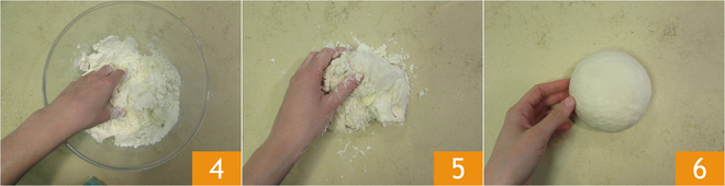 Kneed met de hand 4 en zodra de vloeistoffen zijn opgenomen, leg je het op een werkvlak 5 en vorm je een glad deegbolletje 6.