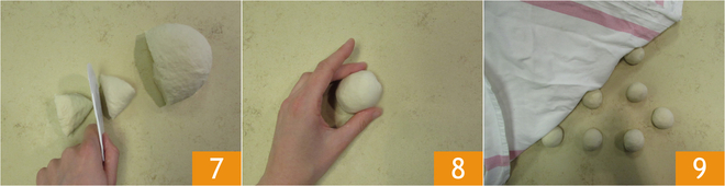 Snijd met een deegsteker stukken van ongeveer 55 g 7. Vorm bolletjes 8 en laat ze afgedekt onder een doek ca. 15 minuten rusten 9.