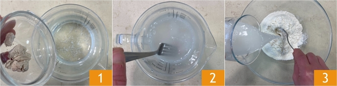 Om de hartige Napolitaanse zeppole te maken verkruimel je eerst de gist in het bruisende water 1 en roer je totdat het volledig is opgelost 2. Giet het water-gistmengsel in een kom waarin je de bloem hebt gedaan 3.