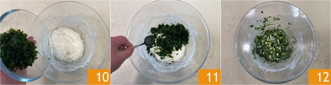 Na de rijs voeg je het fijngesneden zeewier toe aan het deeg 10 en meng je het gelijkmatig door het deeg 1112. Dek opnieuw af met plasticfolie en laat nog 30 minuten rusten.
