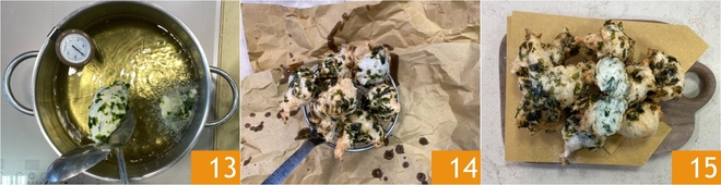 Verhit nu de plantaardige olie tot ongeveer 170C, neem porties deeg ter grootte van een walnoot en laat ze met behulp van 2 lepels in de hete olie glijden 13. Bak enkele stukjes tegelijk 3-4 minuten of tot ze goudbruin zijn. Laat de zeppole uitlekken en leg ze op keukenpapier of frituurpapier 14. Bestrooi naar smaak met zout en serveer meteen je hartige Napolitaanse zeppole 15!