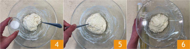 Voeg het zout toe 4 en verwerk het in het deeg 5, dek de kom af met plasticfolie en laat 30 minuten rijzen 6.
