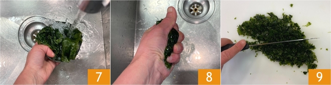 Spoel ondertussen het zeewier goed onder stromend water om het zout te verwijderen 7, knijp het daarna goed uit 8 en hak het fijn met een mes 9.