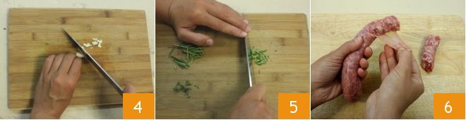 Pel nu een teentje knoflook en hak het fijn 4, pluk vervolgens de takjes rozemarijn en tijm en hak de naaldjes en blaadjes fijn 5. Snijd tenslotte voorzichtig het worstomhulsel in en verkruimel de luganega 6, verwijder het vel en verzamel het vlees in een kom.