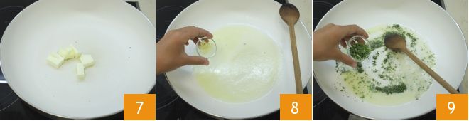 Smelt op dit punt de boter in een ruime koekenpan 7, voeg het gehakte knoflook toe 8 en het gehakte rozemarijn en tijm 9 en laat een paar minuten zachtjes fruiten op laag vuur.