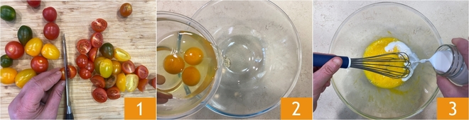 Om de hartige 12-eetlepels taart met cherrytomaatjes en olijven te maken, was je eerst de cherrytomaatjes en halveer je ze 1. Breek de eieren in een ruime kom 2. Klop ze met een garde tot een egaal mengsel en giet vervolgens al roerend de melk erbij 3.