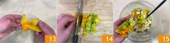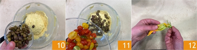 Roer goed door tot je een glad, zacht en klontvrij beslag hebt, voeg dan de ontpitte olijven toe 10 en het grootste deel van de cherrytomaatjes 11. Bewaar er een stuk of tien voor de uiteindelijke decoratie. Maak de courgettebloemen voorzichtig schoon door het binnenste stampje te verwijderen 12.