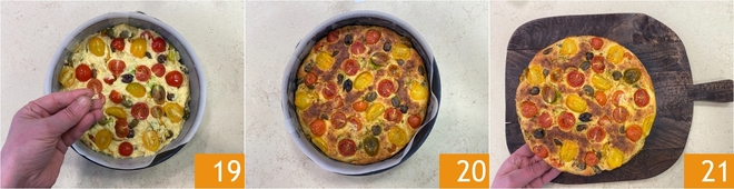 Meng goed zodat alle ingrediënten gelijkmatig verdeeld zijn 16. Bekleed een taartvorm van 24 cm diameter met bakpapier en giet het mengsel erin 17. Egaliseer het oppervlak met de bolle kant van een lepel en garneer vervolgens met de achtergehouden cherrytomaatjes 18.