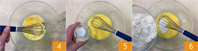 Voeg de olie al gietend toe terwijl je blijft kloppen 4; voeg het zout toe 5 en de gezeefde bloem 6.