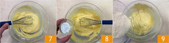 Meng met een garde 7, voeg daarna ook het gezeefde bakpoeder 8 en de geraspte Grana toe 9.