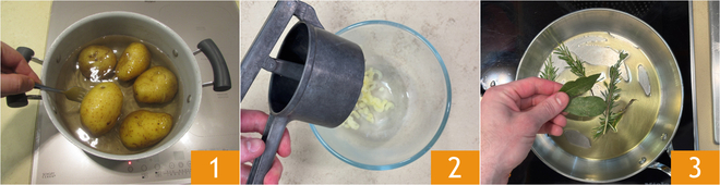 Om de hartige taart met aardappel en worst te bereiden, begin je met de aardappelen: doe ze in een pan met ruim koud water, breng aan de kook en reken vanaf dat moment ongeveer 30-40 minuten. Wanneer ze zacht zijn in het midden 1, druk je ze met de schil erop plat terwijl ze nog warm zijn 2. Zet ze even apart en ga ondertussen verder met de worsten: giet een scheutje olie in een koekenpan en voeg de rozemarijn en laurier toe 3.