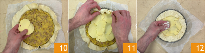 Leg de kaas in plakken en laat rondom bij de rand een klein vrij stukje 10, vouw de randen dicht door ze samen te knijpen, zodat er een gevlochten motief ontstaat 11. Bestrooi het midden met geraspte kaas 12.