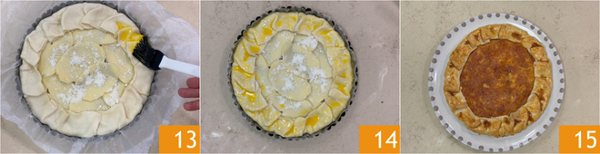 Bestrijk de rand met het eigeel 13 en zet in de oven 14: bak in de gewone (niet-hetelucht) stand op 180° gedurende 30 minuten, zet daarna de grill aan voor nog 5 minuten tot de bovenkant goudbruin is. Je hartige taart met aardappel en worst is klaar; laat hem een paar minuten afkoelen voordat je hem aansnijdt en ervan geniet 15!