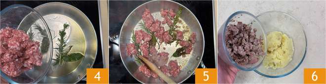 Wanneer de bodem heet is, voeg je de worst toe die je van het vel hebt ontdaan 4 en bak je goed rul, terwijl je hem met een houten lepel uit elkaar haalt 5. Meng de gebakken worst door de geprakte aardappelen 6.
