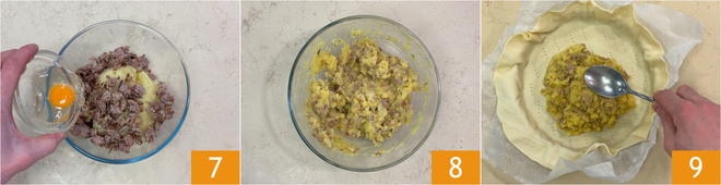 Voeg ook het ei toe 7 en meng goed door 8. Rol het bladerdeeg met het bakpapier uit en bekleed een vorm van 24 cm, prik daarna de bodem in. Vul het deeg met het aardappel- en worstmengsel en strijk glad 9.