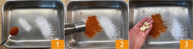 Om de zelfgemaakte kebab te maken bereid je eerst de marinade voor het vlees: doe in een ruime ovenschaal het zout, de paprikapoeder 1, de peper 2 en de uitgepelde en licht gekneusde teentjes knoflook 3.