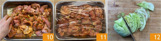 Wrijf het vlees met je handen in zodat de marinade gelijkmatig intrekt 10, dek het daarna af met vershoudfolie en laat het minstens 4 uur in de koelkast marineren 11. Tegen het einde van de marinatietijd kun je de groenten klaarmaken: was de sla en snijd deze in reepjes 12.