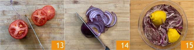 Was en snijd ook de tomaten in plakken 13. Maak de ui schoon en snijd die in dunne ringen 14, doe ze vervolgens in een kom met water, ijs en het sap van de 2 citroenen zodat de scherpe smaak minder wordt 15.