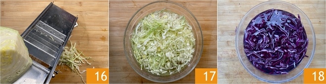 Snijd tenslotte de witte kool met een mandoline 16 en laat deze weken in koud water 17. Doe hetzelfde met de rode kool 18.