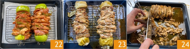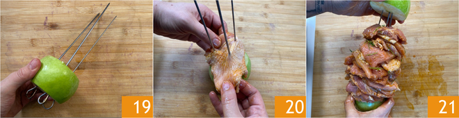Haal het vlees uit de koelkast. Neem een appel en verwijder de boven- en onderkant, snijd hem vervolgens horizontaal doormidden. Steek 3 stalen spiesen in een halve appel 19, rijg vervolgens de plakjes vlees aan de spiesen, afwisselend kip en kalfsvlees 20. Als je bij het eind bent, sluit je de spies met de andere halve appel 21. Herhaal op dezelfde manier om de tweede spies te vormen.