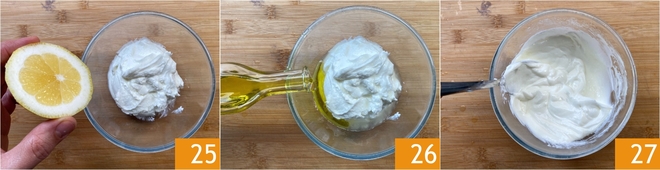 Tot slot maak je de yoghurtsaus: schep de Griekse yoghurt in een kom, voeg dan het citroensap 25 en de olie 26 toe en roer goed door 27. Als je wilt kun je ook een paar druppels tabasco toevoegen.